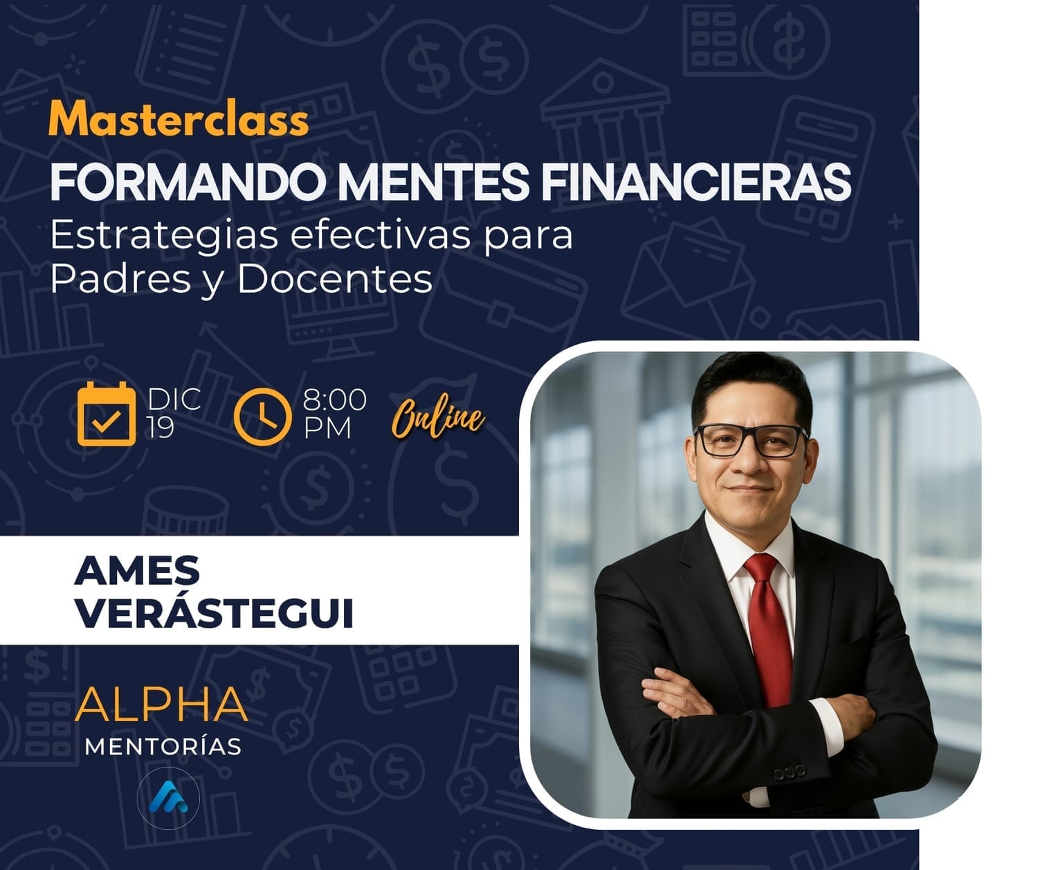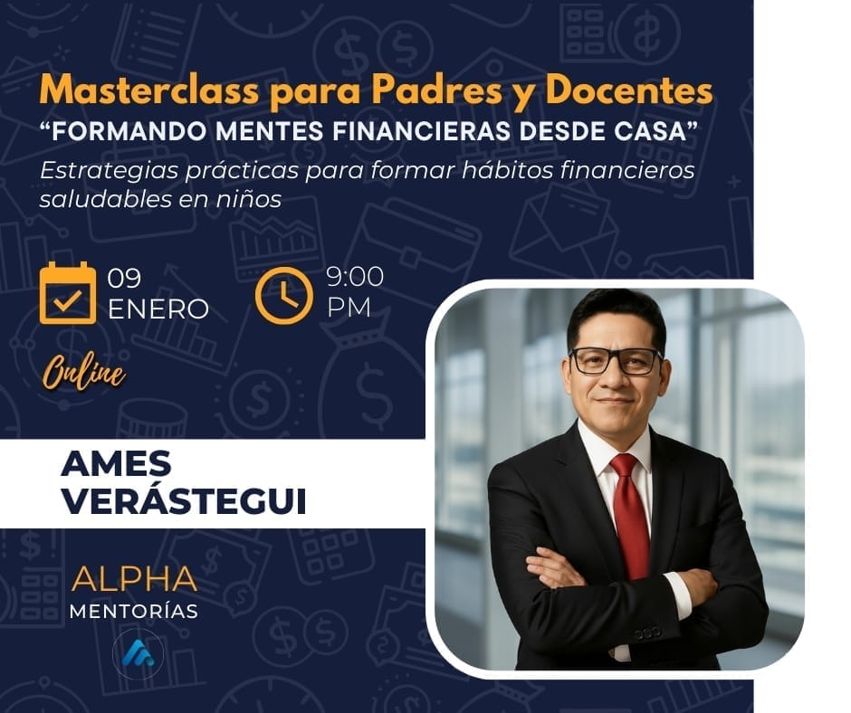 Una sesión exclusiva con Ames Verástegui, experto en finanzas familiares y desarrollo humano, creada especialmente para padres y docentes que desean formar niños con una mentalidad financiera sana y responsable.